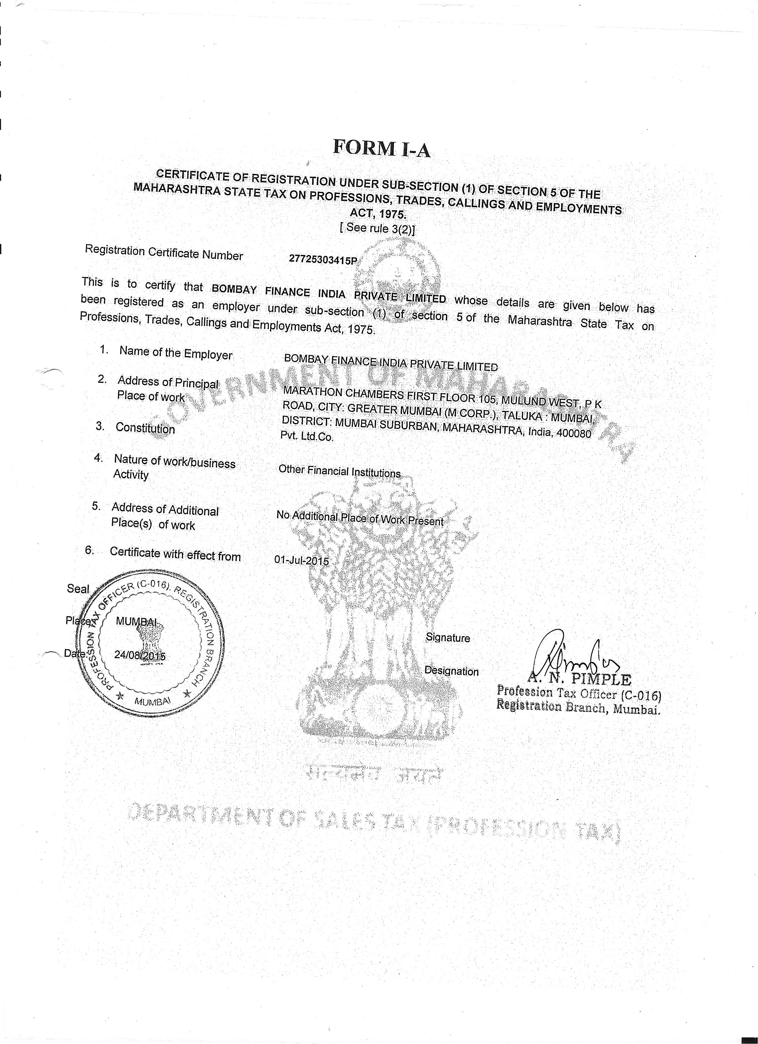 We are proud to announce that Bombay Finance India Private Limited has officially been issued the Form I-A Certificate of Registration under sub-section (1) of section 5 of the Maharashtra State Tax on Professions, Trades, Callings and Employments Act, 1975.